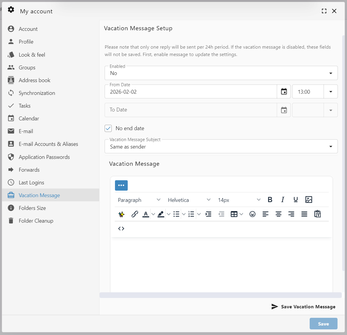 Pro-Tip: If you are using the date range feature, your vacation message will automatically stop sending at the end of your "To" date, so you don't have to worry about turning it off the moment you get back!