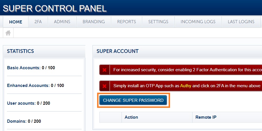 Your Super Panel is the command center for your entire email infrastructure. To keep your account secure, we recommend updating your master password periodically and enabling additional security layers like Two-Factor Authentication (2FA).